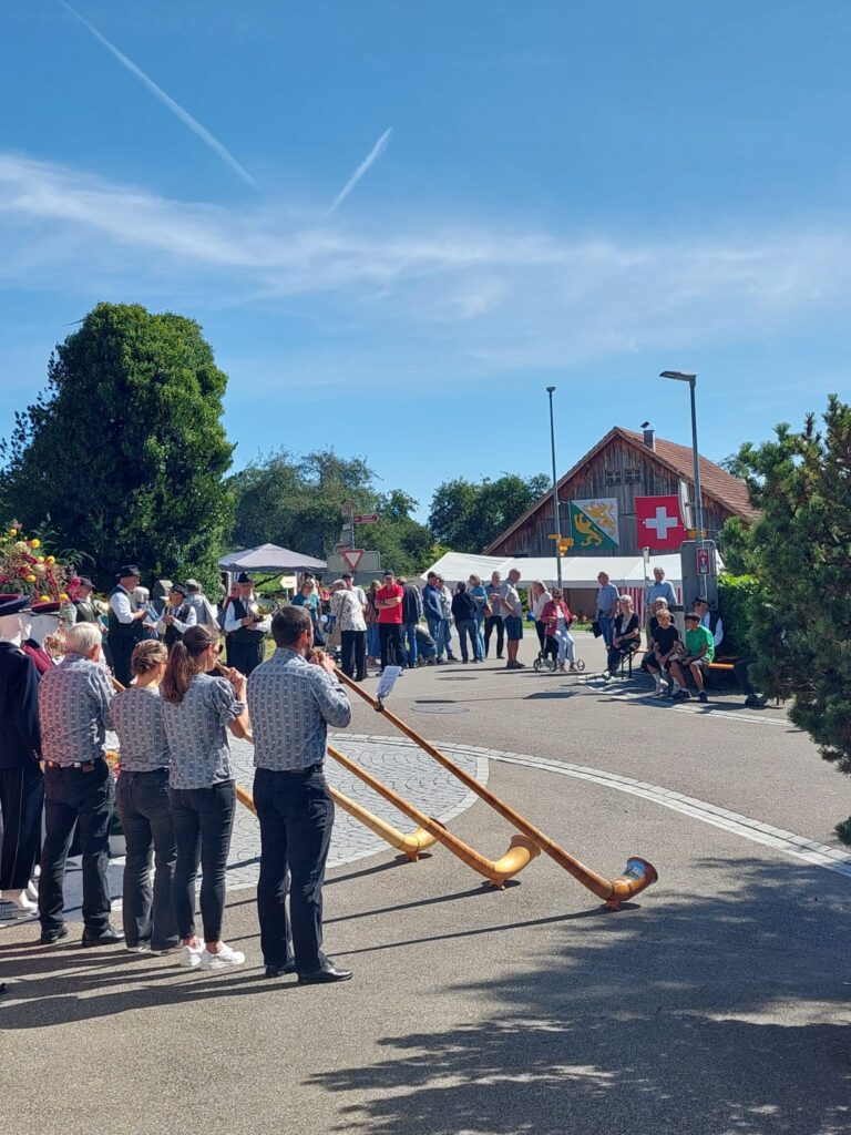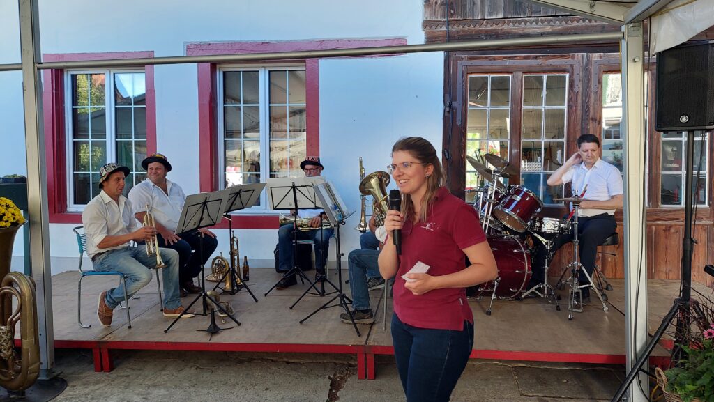 Mit der Musig-Bühni durften wir das Jubiläum musikalisch bereichern. Von 11.00 bis 20.00 Uhr traten insgesamt neun Formationen auf – um einige zu nennen ging es von der Jagdhorngruppe über traditionelle Kleinformationen verschiedener Musikgesellschaften, die Alphornformation Obergriesen bis hin zur Jungbläserformation der Musikgesellschaft war alles vertreten. Wir selbst standen um 19.00 Uhr auf der Bühne. Für jeden Geschmack war etwas dabei, und die Stimmung im Zelt war durchgehend bombastisch!