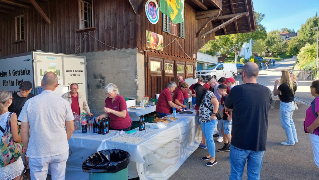 Auch das Festwirtschaftsteam war unermüdlich im Einsatz und servierte Grillspiesse, Würste und Pommes. Ein Highlight war der immer frisch zubereitete Apfelkuchen. Ja, wir hatten einen Backofen auf dem Platz. Das Wetter spielte perfekt mit – nicht zu warm, nicht zu kalt. So konnte man gemütlich über die Festmeile schlendern oder im Musig-Zelt bei guter Musik das Fest in vollen Zügen geniessen. Für uns war es zudem eine Plattform, um auf unsere Neuuniformierung aufmerksam zu machen. So konnten alle Uniformen, welche wir bis jetzt hatten bestaunt werden. Seien Sie gespannt, mit welcher wir in die Zukunft marschieren.