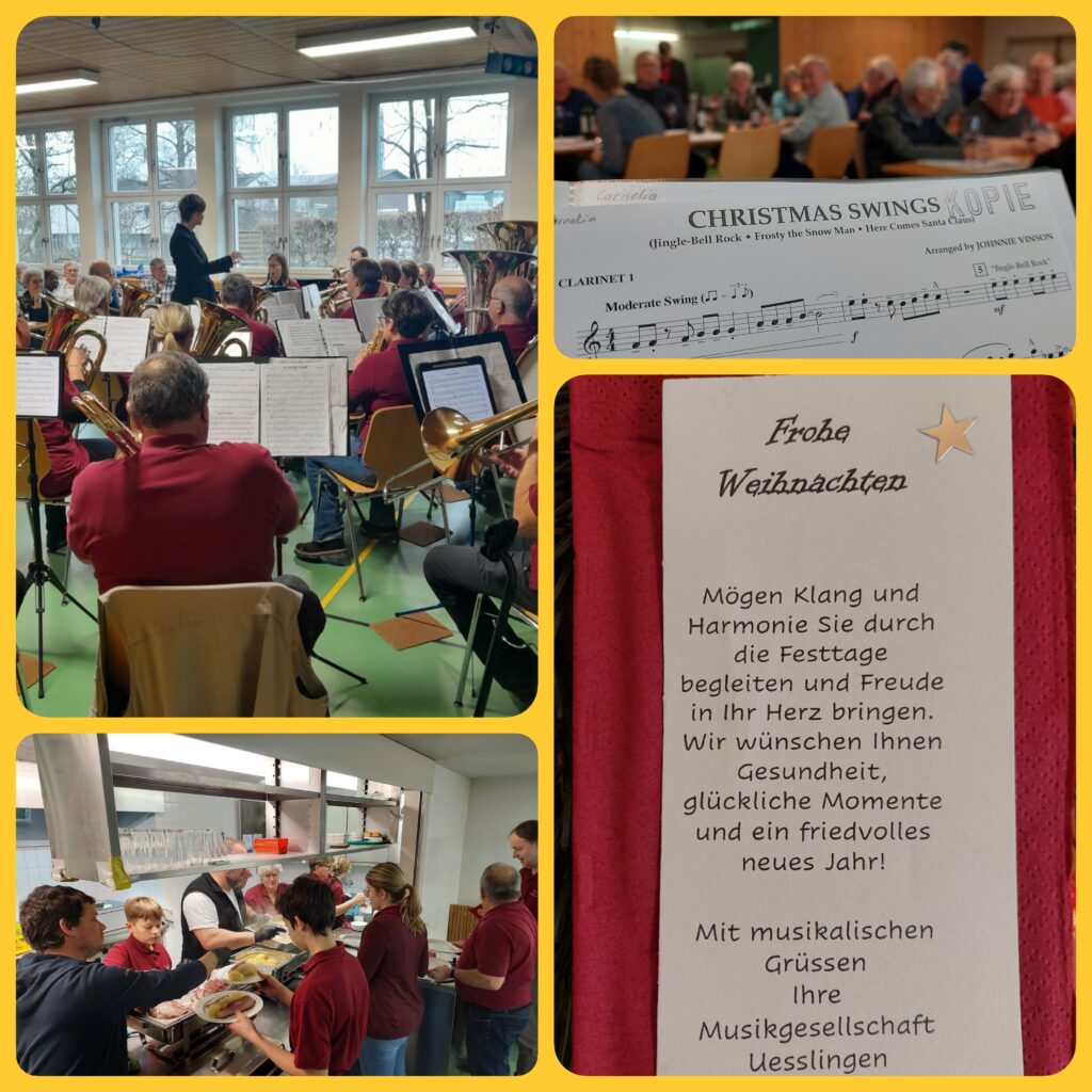Danach ging es weiter mit «Ich war noch niemals in New York». Bevor mit «Christmas Swings» langsam Weihnachtsstimmung aufkam, wurde Romy Stillhard für ihr langjähriges Engagement für die Pro Senectute mit grossem Dank durch Gemeinderätin Sabrina Toppius, verabschiedet. Traditionell spielten wir vor dem Dessert «Stille Nacht, Heilige Nacht».